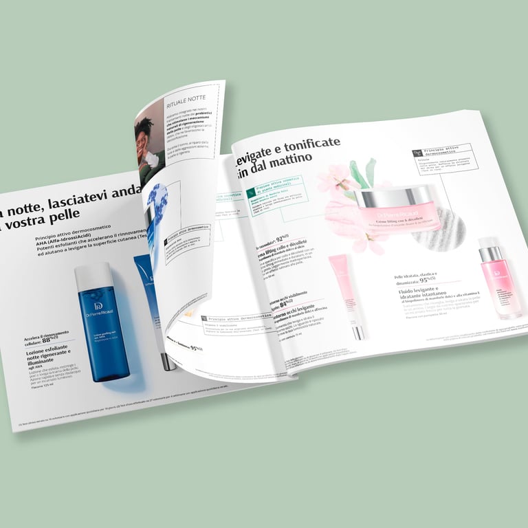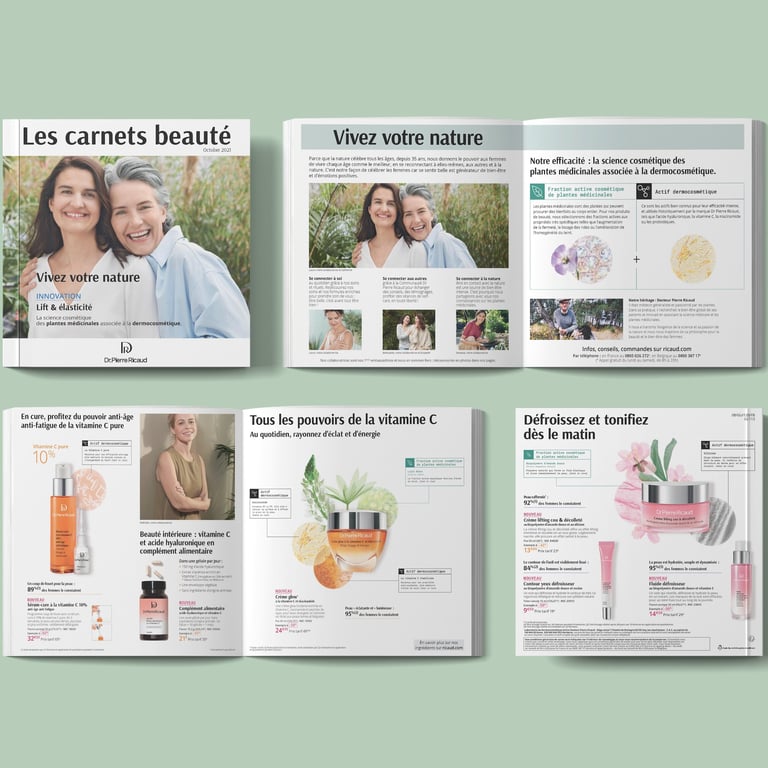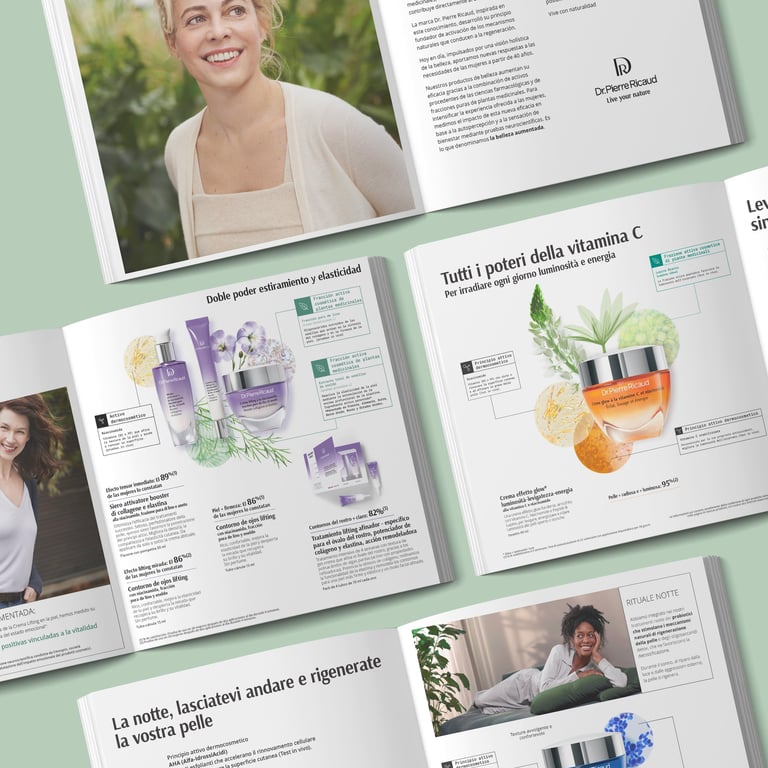 Mise à jour du catalogue Dr. Pierre Ricaud France et adaptation graphique et linguistique pour les marchés espagnol et italien, dans le respect de la charte.